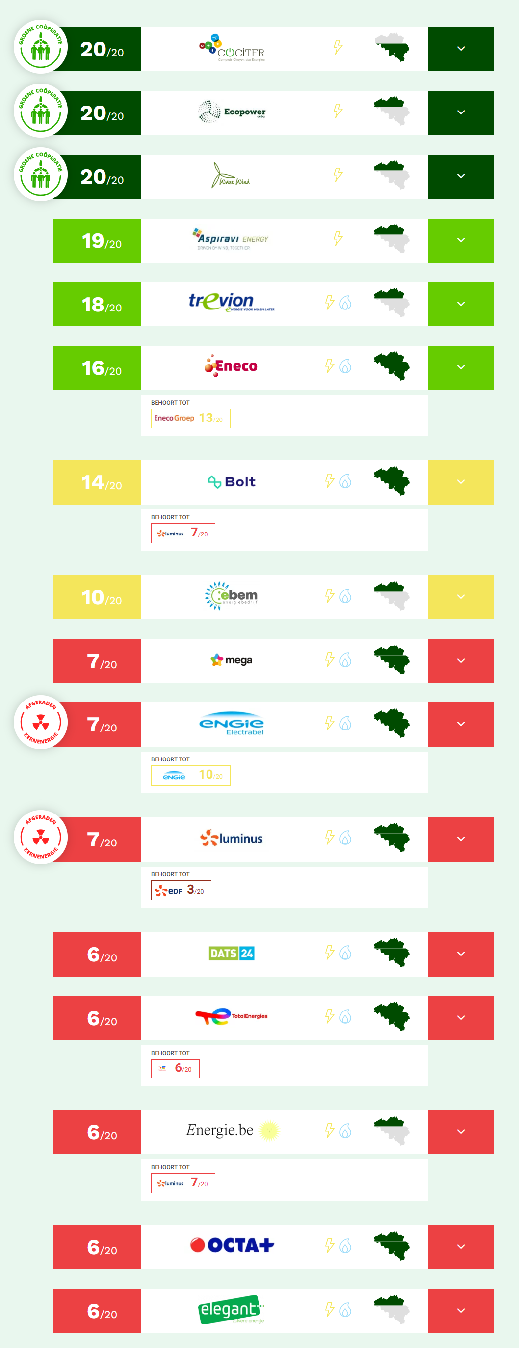 Mega, Engie en Luminus halen elk een score van slechts 7/20. Bij Mega is de rechtstreekse aankoop van hernieuwbare energie bij de producent sterk verminderd. Engie gaat er, ondanks de nog steeds ondermaatse score, licht op vooruit en dat voornamelijk door de definitieve stillegging van scheurtjesreactor Doel 3. Luminus zet een klein stapje vooruit en scoort 1 punt meer dan voordien.