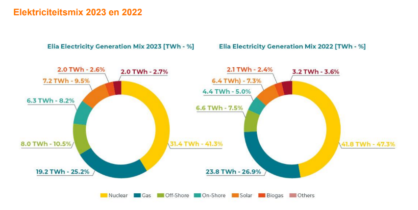 Door de sluiting van Doel 3 eind september 2022 en Tihange 2 in februari 2023 werd minder kernenergie geproduceerd. Daardoor daalde het aandeel kernenergie in de energiemix van 47,3% in 2022 naar 41,3% in 2023. De productie voor gas was in 2023 19,2 TWh.